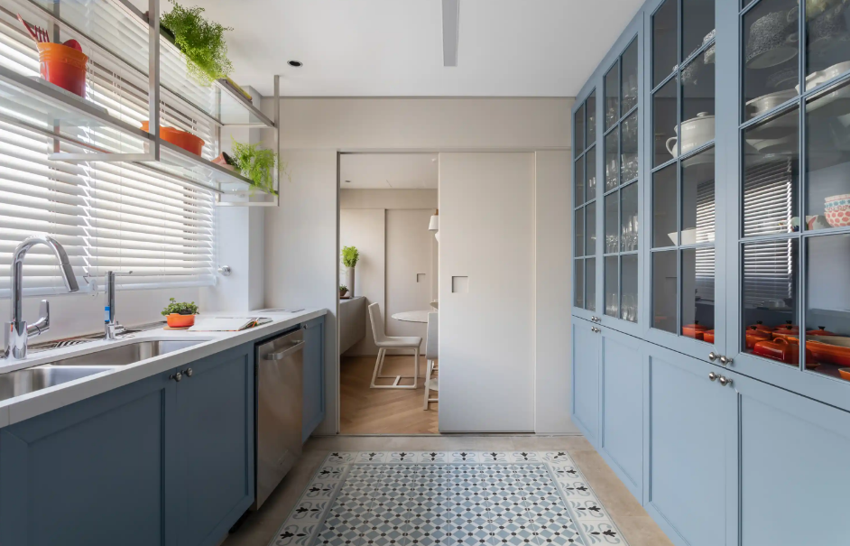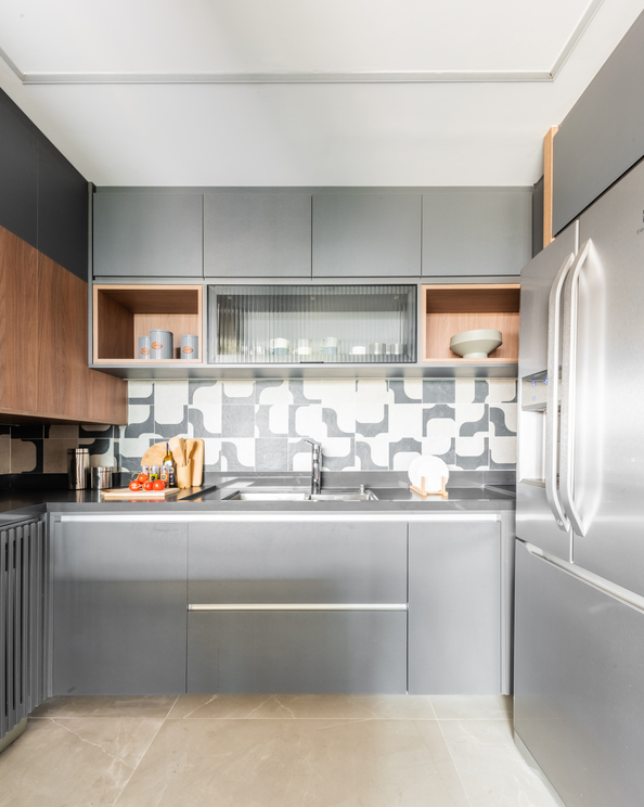 A cristaleira combina armazenamento e exposição, com portas de vidro que valorizam louças, taças e peças especiais. Protege os itens e reforça a estética do projeto, por isso é o melhor armário de cozinha decorativo no ambiente.