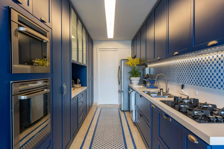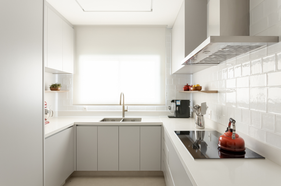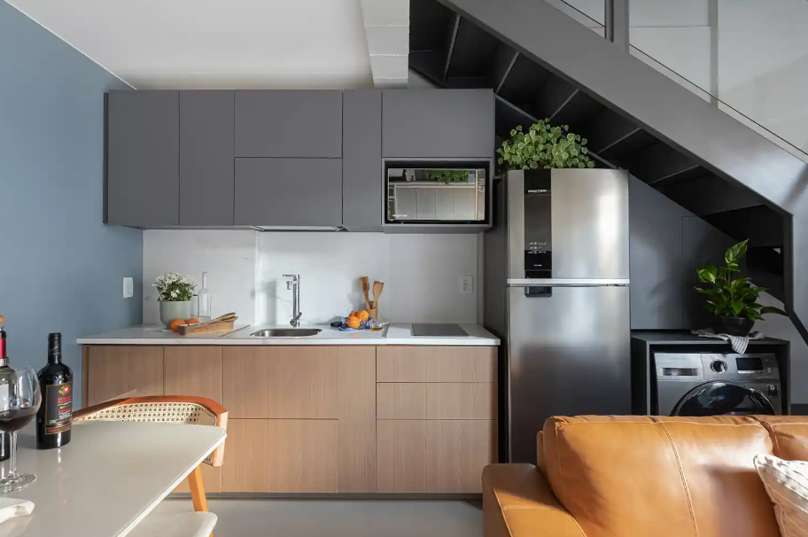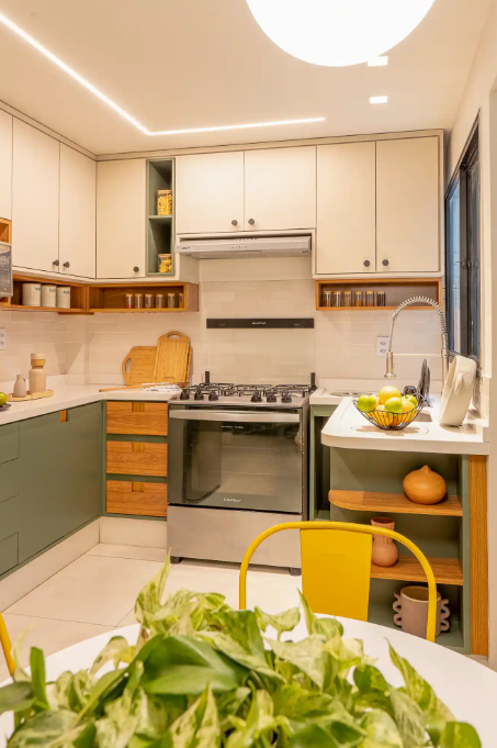 O armário de canto transforma áreas pouco aproveitadas da cozinha em espaços úteis de armazenamento sem comprometer a circulação. É muito utilizado em espaços com metragens reduzidas.