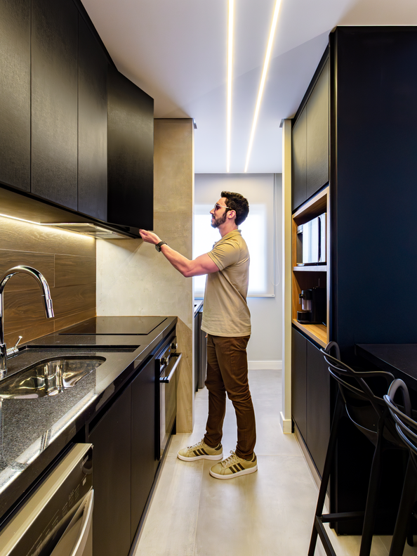 A torre quente organiza forno e micro-ondas em nichos verticais. É um móvel prático para o dia a dia que melhora a ergonomia e contribui para uma circulação fluida, especialmente em cozinhas integradas ao restante da casa.