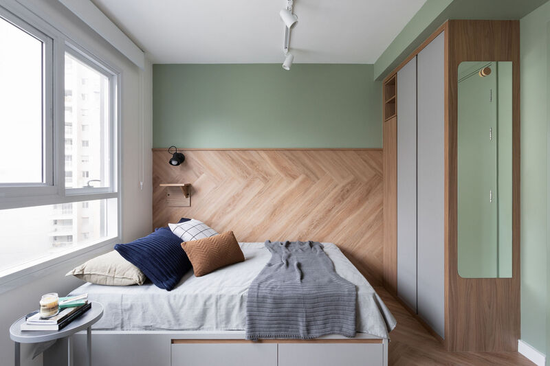 3. Piso marrom madeira destaca o verde oliva da parede e dos móveis deste quarto – Foto: Thiago Travesso | Projeto: Carol Goncalves - Tatu Arquitetura