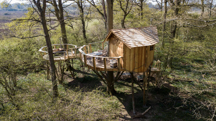 The Peregrine Treehouse (shown here) is off-grid, like all of Knepp’s accommodation. It has a battery hurricane lamp, bedside reading lights, and a candle lantern. Plus: “an open-air, wood-fired Swedish Hikki bath-tub on a separate platform reached by a wooden walkway.”