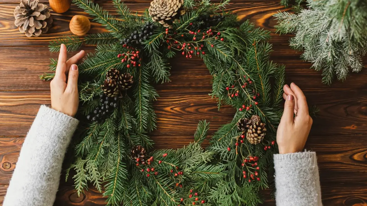 Forage for wreath materials, and the only expense is the energy it takes to collect your materials. Use rosehips, cones, dried flowers, and feathers to create a varied display. A red bow gives the wreath a Christmasy vibe, but the sky is the limit here.