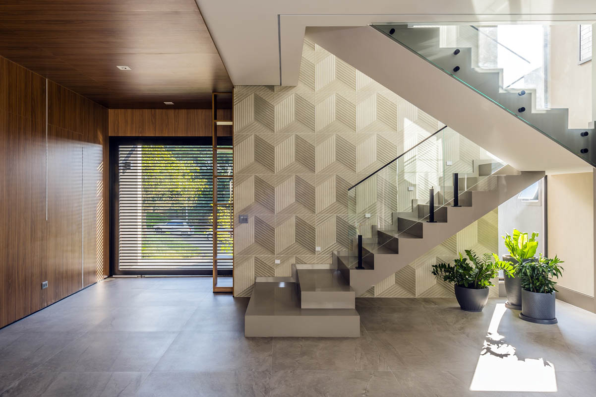 No projeto acima (foto em destaque), o profissional propõe um jogo geométrico de formas e texturas no revestimento da parede, utilizando a escada cinza de dois lances como pano de fundo para o ambiente. A escada, com parapeito de vidro, é perfeitamente integrada à composição do espaço, criando uma transição fluida entre os ambientes. A parte inferior da escada, por sua vez, foi cuidadosamente planejada para abrigar vasos orgânicos de diferentes tamanhos, dando um toque de natureza e leveza ao design.