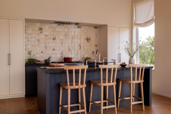 Inside, tall windows orient each room towards the carefully landscaped grounds, flooding the interiors with abundant natural light. A warm, lived-in feeling is achieved through the layering of considered textures: custom mixed Portola Paint plaster finishes on the walls; buffed limestone tiling and rare marbles in the baths; raw wood beams framing the 16-foot ceilings; wide-plank wood floors; and hand-painted tiles by the UK-based artist Aviva Halter and silky honed soapstone in the kitchen.