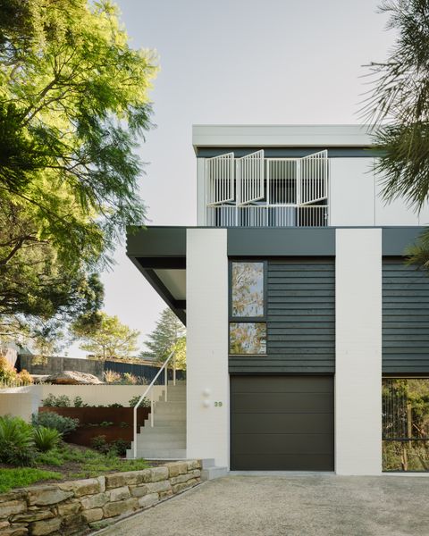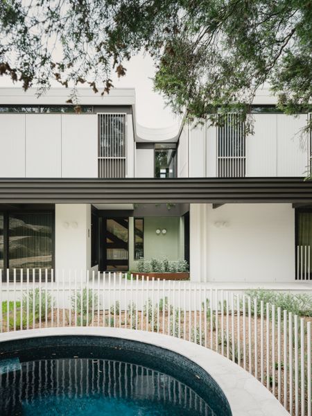 “Inside, the home’s frontage accommodates a lounge room and study, each with elevated views across the leafy street. The original spiral stair was replaced with a playful open-tread stair that follows the home’s central corridor spine. A laundry, walk-in pantry, and powder room are tucked behind, freeing the home’s northern elevation so the kitchen, dining, and sitting areas can take in views of the garden and pool, set against the site’s outcrop of natural rock. Upstairs, four bedrooms and a small sitting room comfortably accommodate the young family and visiting guests. A large bathroom is designed with sharing in mind—the vanity is separated from the other amenities to facilitate multiple users. On the lower ground level, an additional bedroom and bathroom for the family’s nanny sit beside the garage, while excavation below the property allowed for the inclusion of a storage wall, wine cellar, and cinema room.