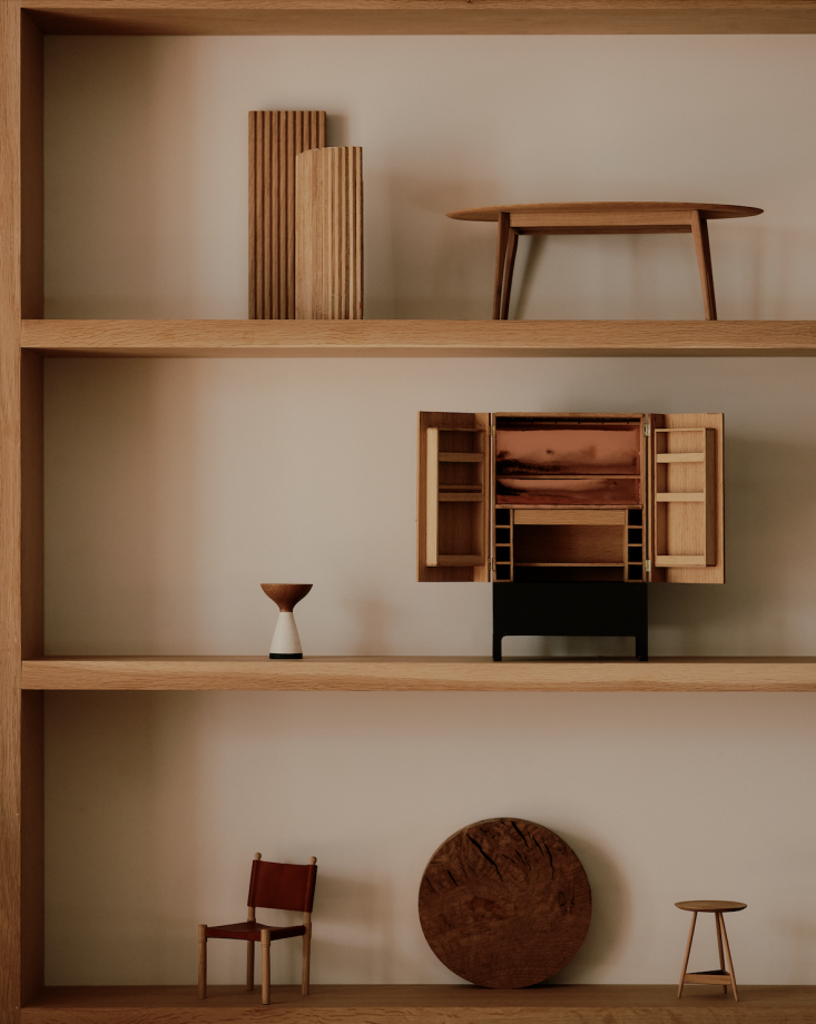 Above: The shelving displays scaled miniatures of the Pinch collection and samples of larger design details.