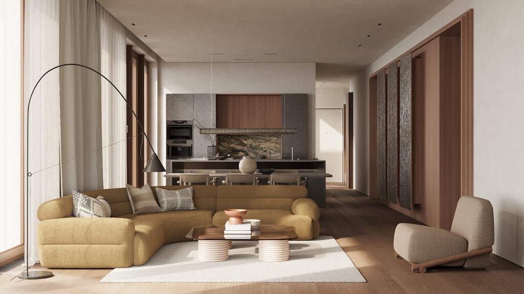 The living room in Studio Warm feels like a quiet exhale at the end of a long day. Natural light floods in through soft drapes. This washes over the warm oak floors. The golden modular sofa anchors the space with its sculptural curves. Every piece here carries weight but never feels heavy, including the tactile fabrics. Finally, the arched floor lamp adds grace.