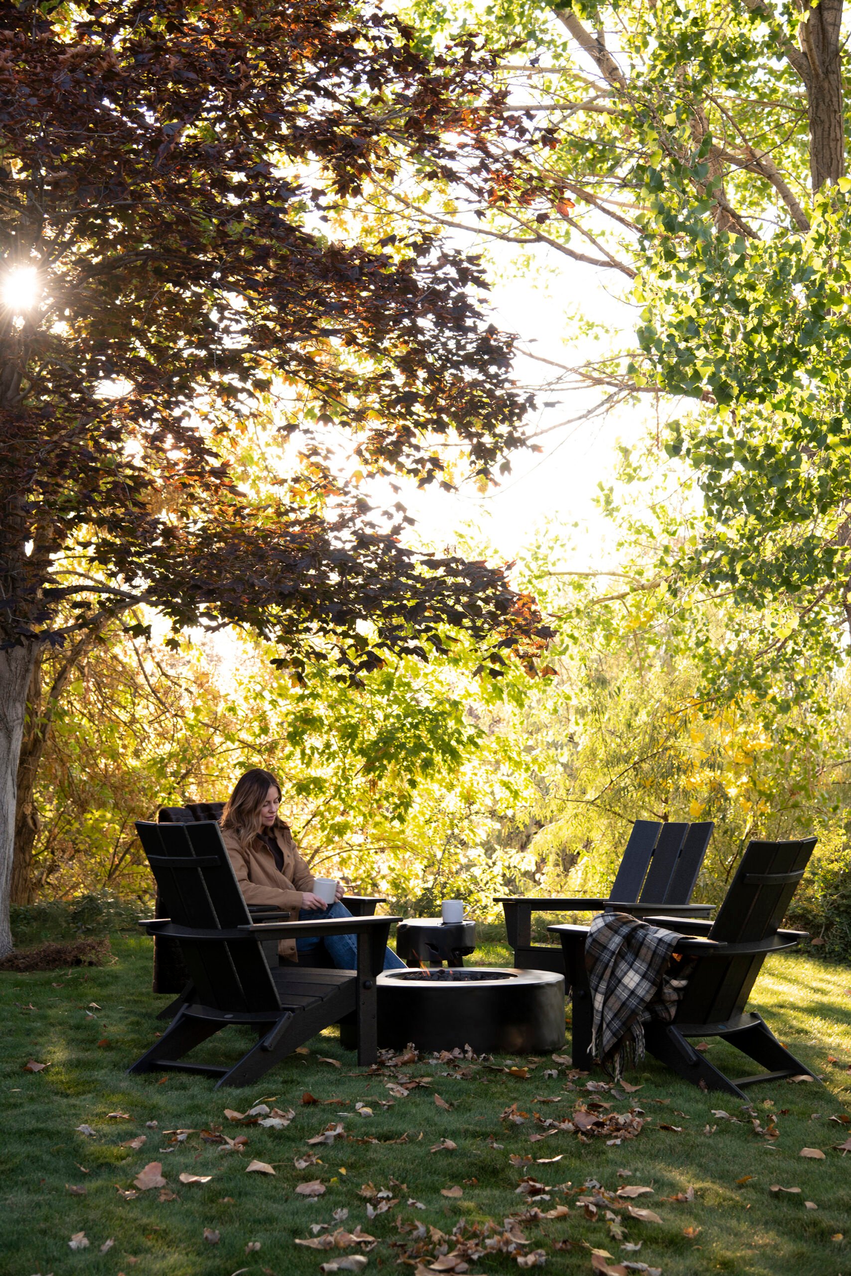 Black Polywood Adirondack Chairs Around Fire with Fall Leaves