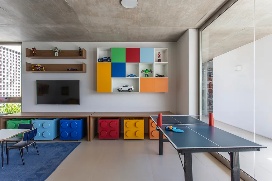 Mesmo em áreas reduzidas, a brinquedoteca cumpre seu papel. Investir em móveis compactos e caixas organizadoras garante um ambiente funcional e agradável.