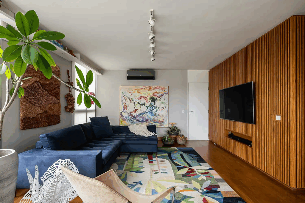 O tapete ajuda a organizar a sala e cria uma área de convivência bem definida. Uma pequena entrada sob o sofá já dá essa sensação, e o espaço livre nas laterais facilita o encaixe de poltronas ou mesas auxiliares sem apertos.