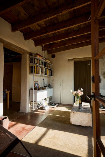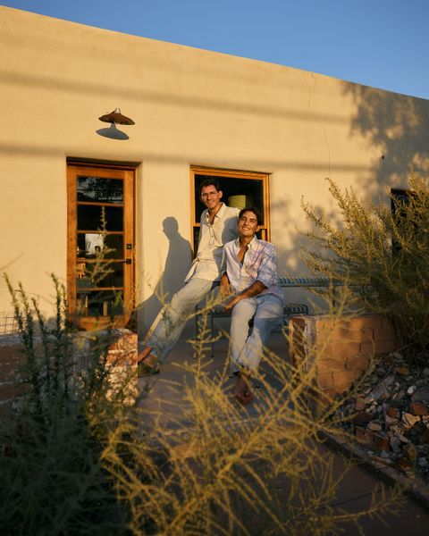 Photographer Logan Havens and designer Gustavo Silva restored an adobe in a Tucson neighborhood known for the structures, honoring the home’s original plan while layering in modern touches. In the living room, Logan sits in a lounge chair by Cade Manning Hayes of Dust Architects. The Pier System shelving unit is from Hay, and the Alvar Aalto 60 stools are from Artek.