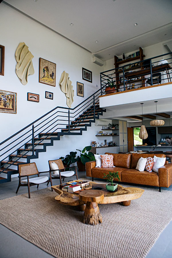 - busque harmonia: repita o material do guarda-corpo ou dos degraus para criar unidade. Combine acabamentos, como madeira escura com móveis escuros.
