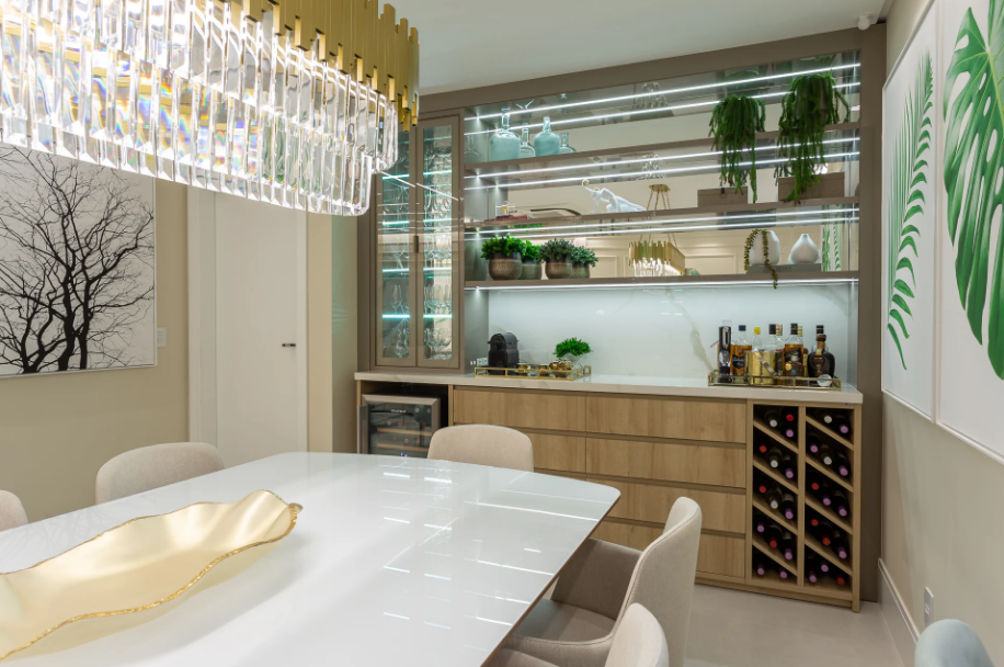 Na sala de jantar, ainda é comum usar para expor louças bonitas e valorizar a decoração do cômodo. Para fugir do tradicional, use para exibir objetos decorativos ou organizar livros, o que traz um visual único e totalmente personalizado.