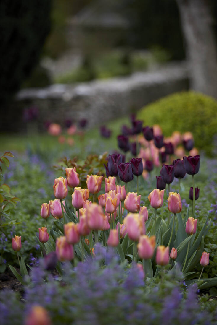 Above: Jewel toned tulips—including ‘Bleu Amiable’ and the two-toned ‘Slawa’—are dotted throughout the herbaceous borders here. As the foliage of other plants rises up, they provide a lush green backdrop before finally enveloping the tulips as they fade. Photograph by Clare Coulson, from Garden Visit: 9 Ideas to Steal from the Bravura Planting at Gravetye Manor in Sussex.