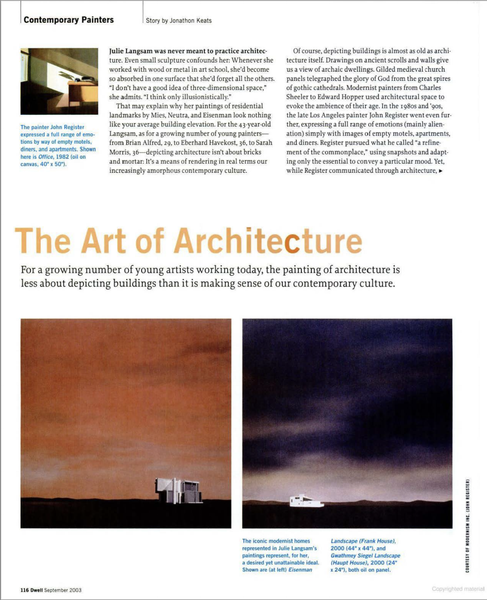 That may explain why her paintings of residential landmarks by Mies, Neutra, and Eisenman look nothing like your average building elevation. For the 43-year-old Langsam, as for a growing number of young painters—from Brian Alfred, 29, to Eberhard Havekost, 36, to Sarah Morris, 36—depicting architecture isn’t about bricks and mortar: It’s a means of rendering in real terms our increasingly amorphous contemporary culture.