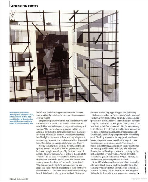 Brian Alfred’s large-scale canvases offer a somewhat different attitude toward modernist architecture. One painting even depicts that holy of holies, the original Bauhaus, receiving a direct blow from a wrecking ball. “With the Bauhaus, there was a very strict ideology,” Alfred explains. “Now it’s exploded and anything can be a viable idea.”