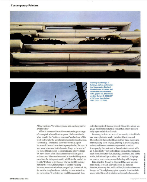Alfred is interested in architecture for the great range of concepts it allows him to express. His foundation in what he calls the “built environment” evolved out of his work in fractals, the use of mathematics to model nature. “Eventually I abandoned the whole formula aspect because all the work was looking very similar,” he says. “I was more interested in the broader things in the world.” He turned his attention to the media and observed that TV news shows often illustrate stories with images of architecture. “I became interested in how buildings are a substitute for things not readily visible to the media,” he recalls. “It’s hard to get footage of what the FBI is doing behind the scenes, for example, so the FBI building becomes a metaphor for how you get kept in the dark. Or, for a while, the glass Enron building became a stand-in for corruption.” If architecture could broadcast all that, Alfred recognized, it could provide him with a visual language both more culturally relevant and more aesthetically open-ended than fractals.