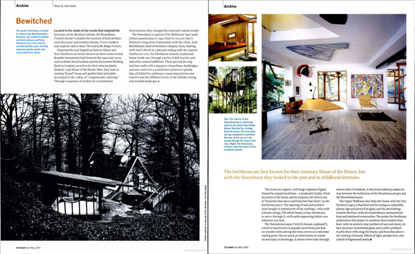 The Hexenhaus is typical of the Smithsons’ later work (Alison passed away in 1993, Peter in 2003) in that it featured a long-term relationship with the client, Axel Bruchhäuser, head of furniture company Tecta. Starting with Axel’s Porch in 1986 and ending with the Lantern Pavilion in 2001, the Smithsons turned a traditional house inside out, through a series of deft touches and delicately realized additions. These pierced the original four walls with a sequence of pavilions, footbridges, annexes, and even a watchtower poised on spindly legs, all linked by walkways connecting interior and exterior and the different levels of the hillside setting and wooded landscape.