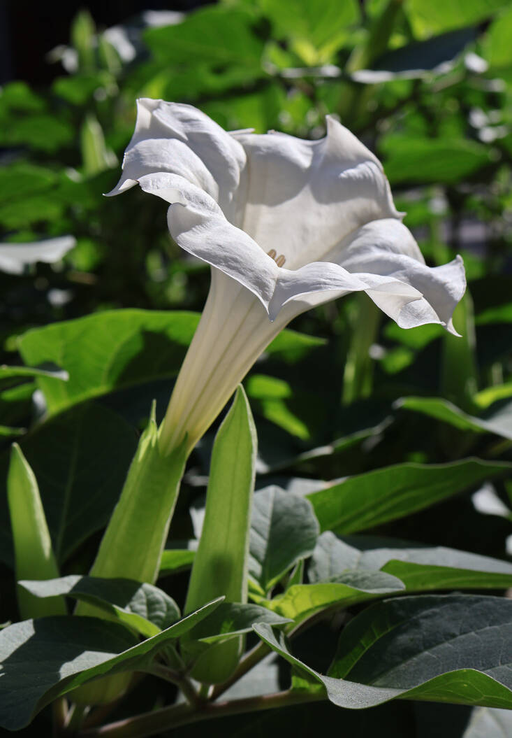 Above: The sculpted, waxy-looking trumpets of Datura last until the middle of the day.