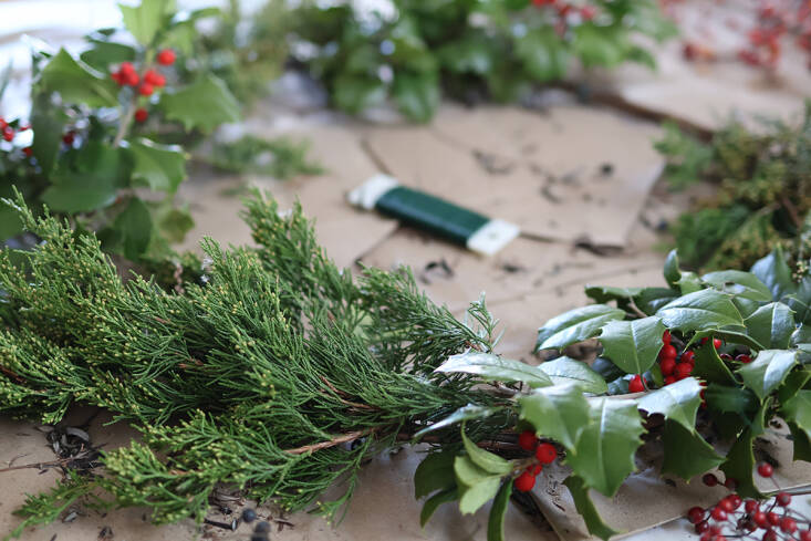 In addition, you will need secateurs for cutting branches, gloves for sharp thorns, and, at home, florists’ wire for easy attachment. (A 22-gauge floral wire is easy to use and very strong.)