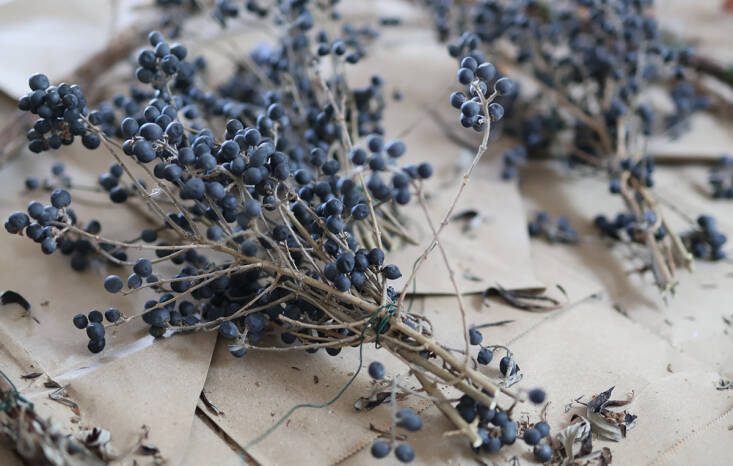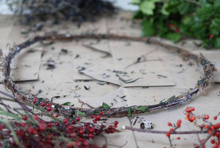 To make a wreath, you need a base or frame to which to attach all your trimmings. Willow is ideal, and red twig dogwood works very well, too. But locally, I gather long mugwort sticks, which are abundant and, yes—again—very invasive. If the mugwort is already dry and brittle, soak it overnight in a bucket before bending the stems easily into a circlet. You need about 15 stems (20-ish inches long) to make a strong base, starting with the thicker sticks and weaving the ends into the next piece to fashion the size you want.