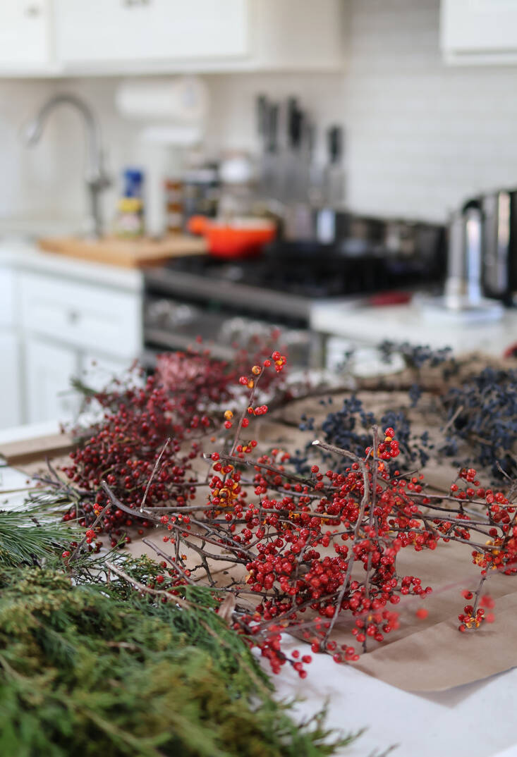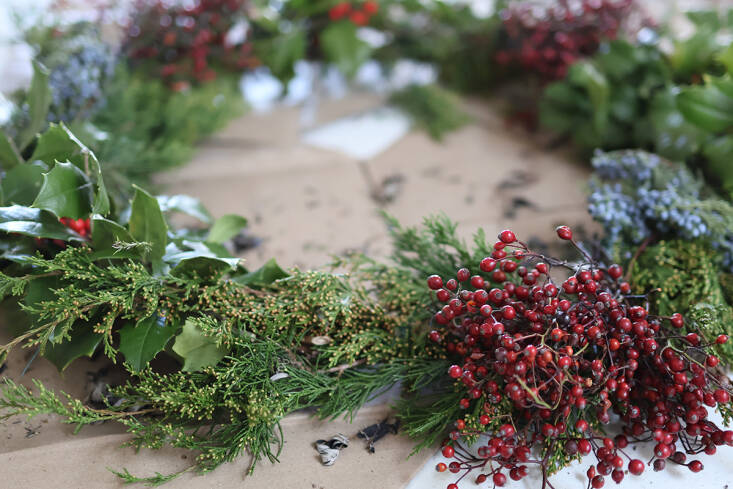 Above: I attach bundles of evergreens and berries, all facing in the same direction.