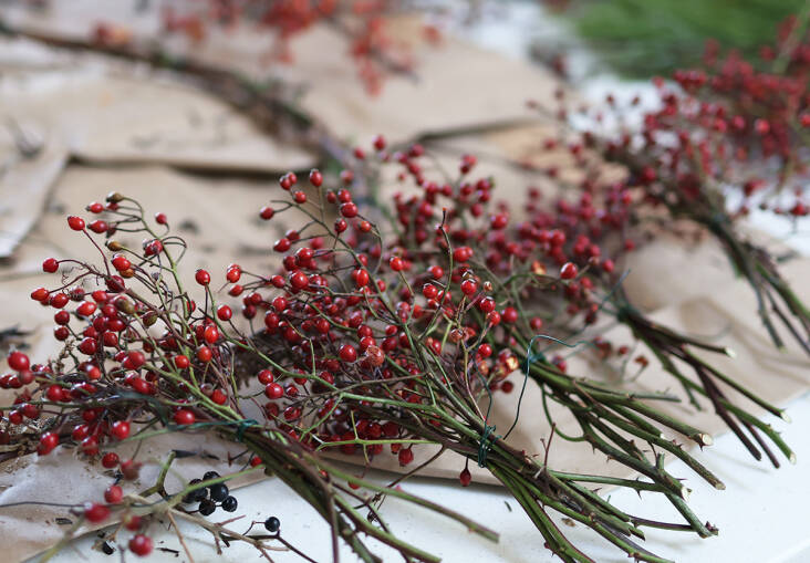 Next, tie little clutches of foliage or berries. Once bundled together into little posies, you’ll secure each bundle to the wreath frame, using the floral wire.
