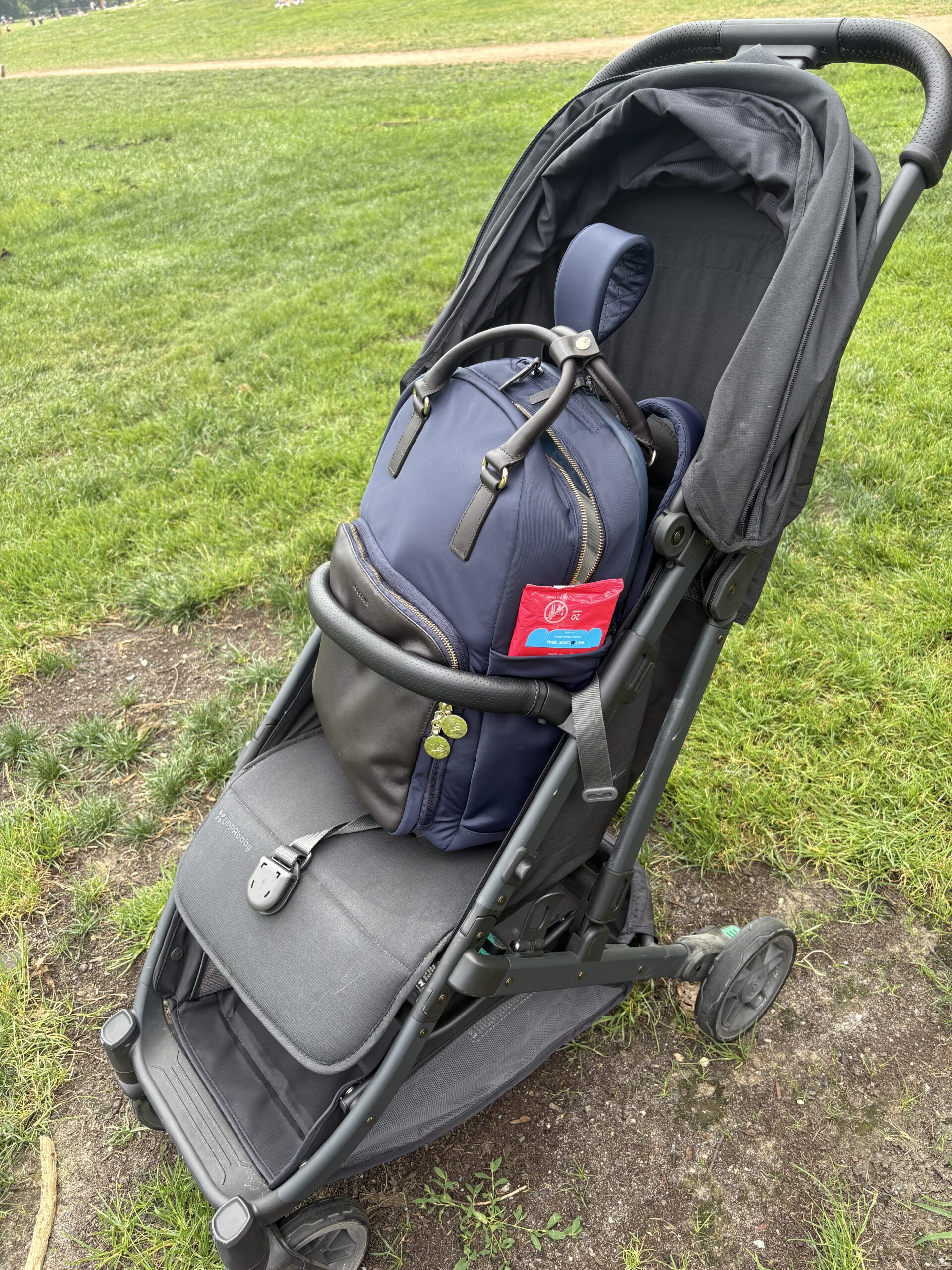 The backpack fit perfectly in our Uppababy Minu travel stroller during an outing with friends in New York City’s Central Park (R).