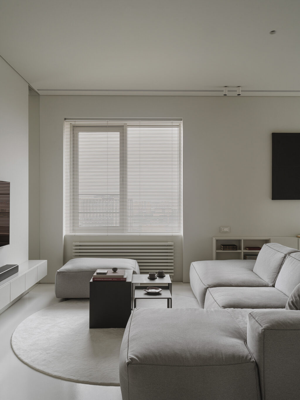 The living area sets a calm and grounded mood. A low, modular grey sofa shapes the room with soft geometry, while the black nesting tables add structure. Light filters through the blinds, highlighting the curved rug and floating TV console. Everything feels simple, balanced, and refined.