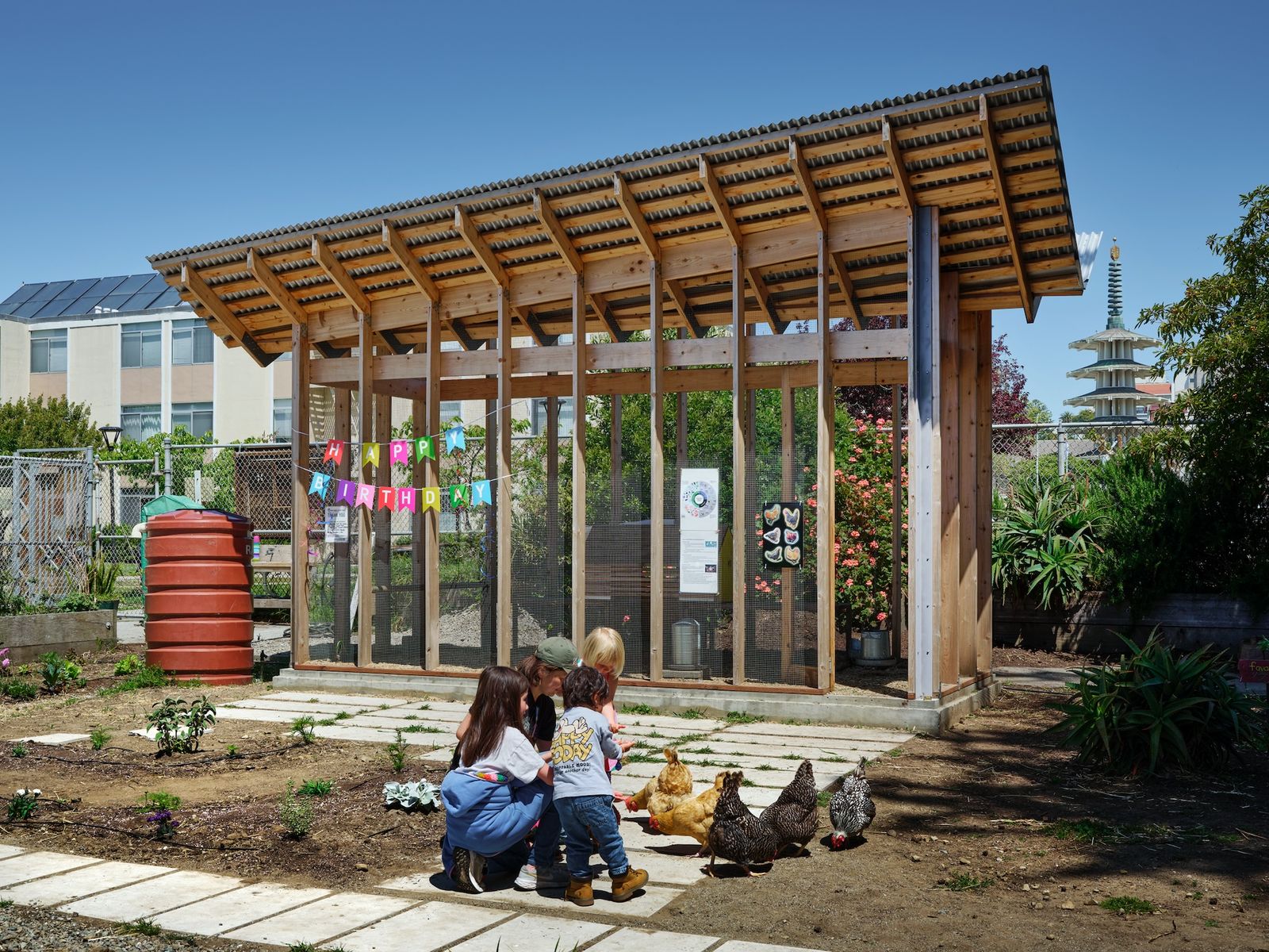 At Rosa Parks Elementary School in San Francisco, one of the most active classrooms happens to be outside. It’s a teaching garden where students learn about plants, water conservation, and biodiversity. The garden is also the site of a striking new chicken coop designed collaboratively between the students and architect David Darling, whose son attended the school. Standing 12 feet tall, with a dramatic butterfly roof, the coop provides a safe home for the school’s five hens—named Pikachu, Totoro, Sunny, Pyopyo, and Oreo—who are campus celebrities. Every morning students open the coop so the hens can scratch around the garden then herd them back inside at the end of the day. “Kids get to understand where their food comes from, they develop empathy with the chickens, and they get to see this microcosm of all these things, which is pretty cool,” Darling says.