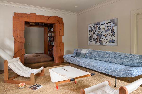 It was a request for a custom staircase runner that eventually led to the two wooden sculptures in a 1909 carpenter-style house in Berkeley: one, a threshold portal, and the other forming a reimagined fireplace mantel. The result is as singular as the request.