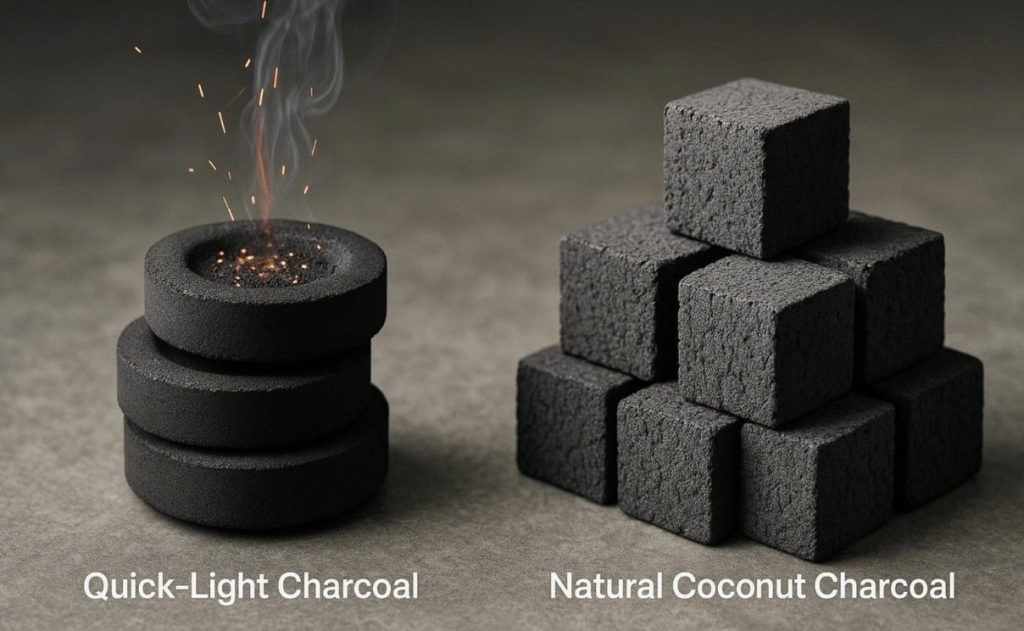 Natural coals, especially coconut shell briquettes, keep flavor clean. They need a burner or stovetop to light, since they have no accelerants, and take a few extra minutes. The taste payoff is worth it. Brands like Fumari sell quality coconut coals in different sizes. If you’re new and don’t have a burner yet, you can begin with quick-lights, then switch to natural coals once you’re ready.
