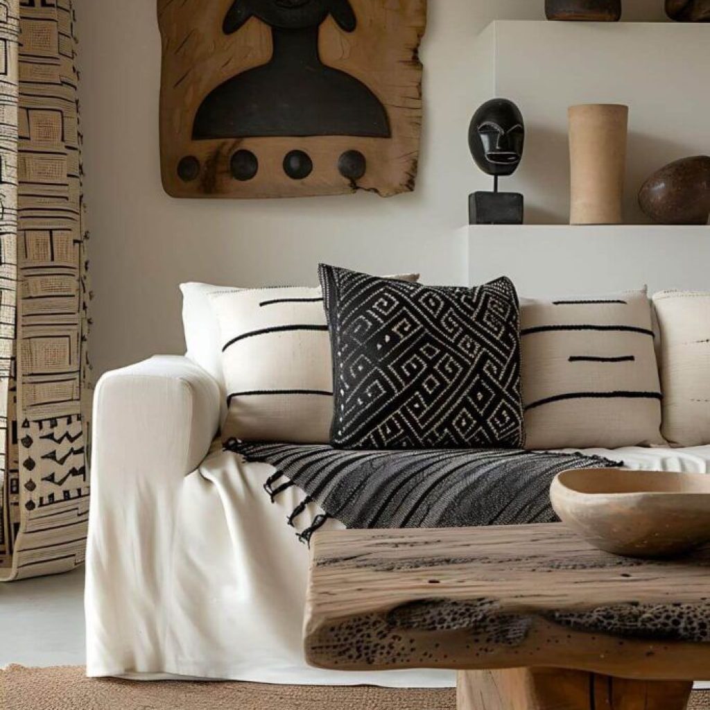 Imagine a sleek modern sofa in neutral linen paired with handwoven African throw pillows. The contrast not only elevates the design but also ensures comfort and practicality.