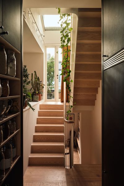 “Careful detailing throughout the home reflects a sense of cohesion and craftsmanship. The staircase draws on Victorian detailing, while embracing contemporary materiality with sharp, confident lines. Similarly, small design touches like the use of salvaged and reclaimed materials speak to an ethos of sustainability, resourcefulness, and material upcycling. Much of the finishing work was done by Nathaniel over a two-year period after the family moved in just before the first pandemic lockdown in early 2020. This phased approach contributed to the home’s character: layered, lived-in, and imbued with a sense of evolving ownership. Built-in ash cupboards and shelves complement the more elemental palette, while deep kitchen surfaces of maple butcher’s block set into stone offer a more grounding contrast.”