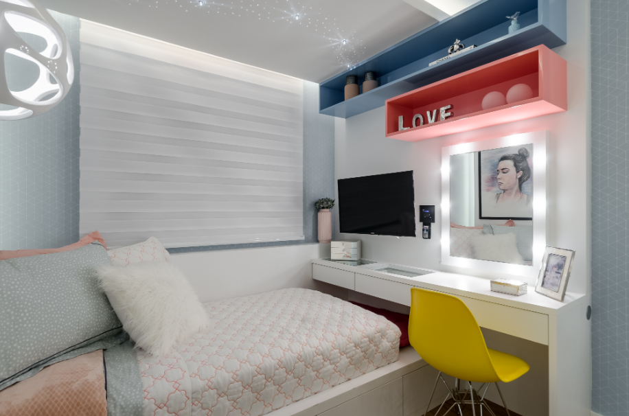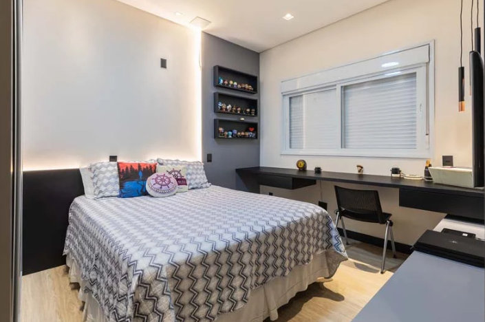 Depois, ajuste o estilo ao clima do quarto. Em quartos de adolescentes, modelos coloridos ou hexagonais deixam a decoração mais marcante. Já em quartos com visual clássico, versões brancas ou em madeira se encaixam com facilidade. Use para fotos, troféus, plantas e itens de coleção.