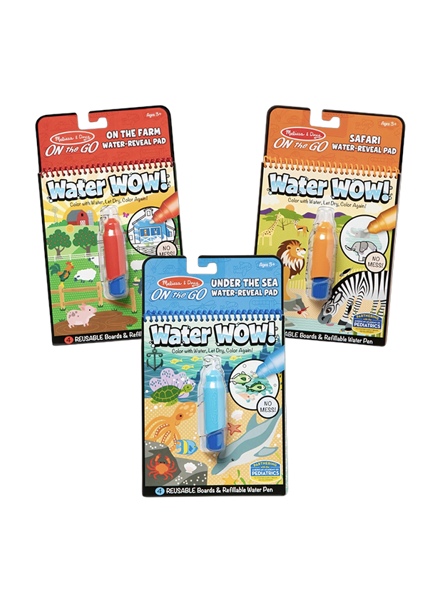 Water Wow! Pads: Best restaurant activity ever. A reusable coloring pad with water “pens” that are easy to refill and store in the front.