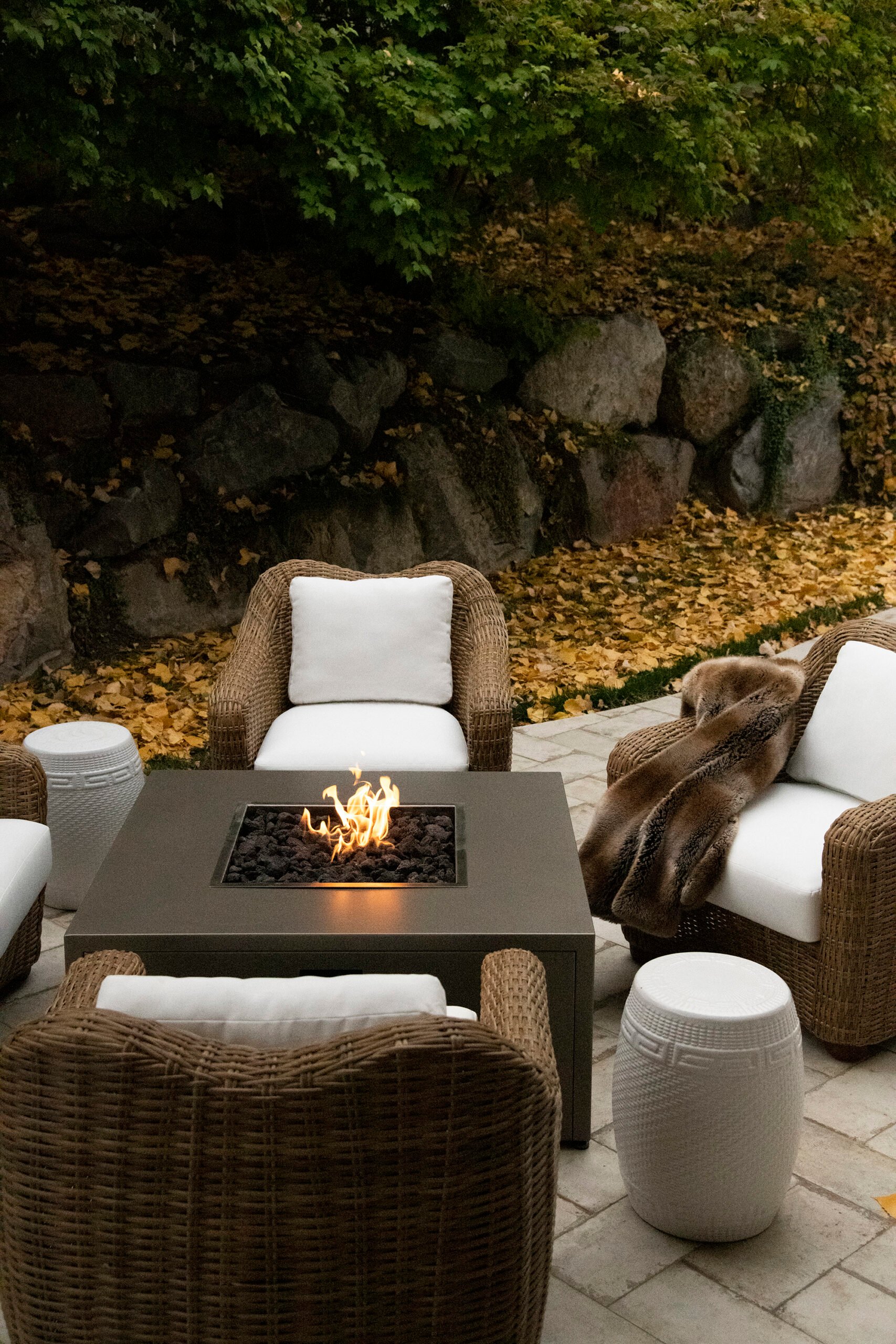 This seating area is adjacent to our outdoor dining space and outdoor kitchen… to give you a visual reference. Once the flooring was in place, we centered the design around a square gas fire pit. It feels architectural and grounded, but our main reason for swapping our existing outdoor sectional was comfort. Four chairs felt more comfortable, cozy, and intimate. We waned something with a larger scale. The fire pit brings people together naturally and adds warmth during cooler evenings, extending our outdoor season well into fall.