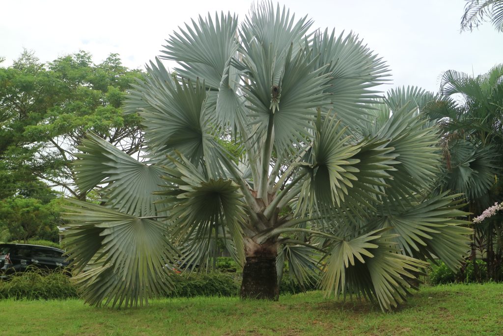 A palmeira azul (Bismarckia nobilis), nativa de Madagascar, é valorizada por suas folhas azuladas e seu tamanho marcante. Muito usada em paisagismo, impressiona pela aparência robusta e pela durabilidade. O tronco pode atingir 30 a 45 cm, com marcas arredondadas distintas.
