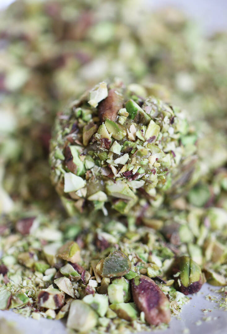 Above: The cookie dough is rolled in roughly chopped pistachio nuts before baking.