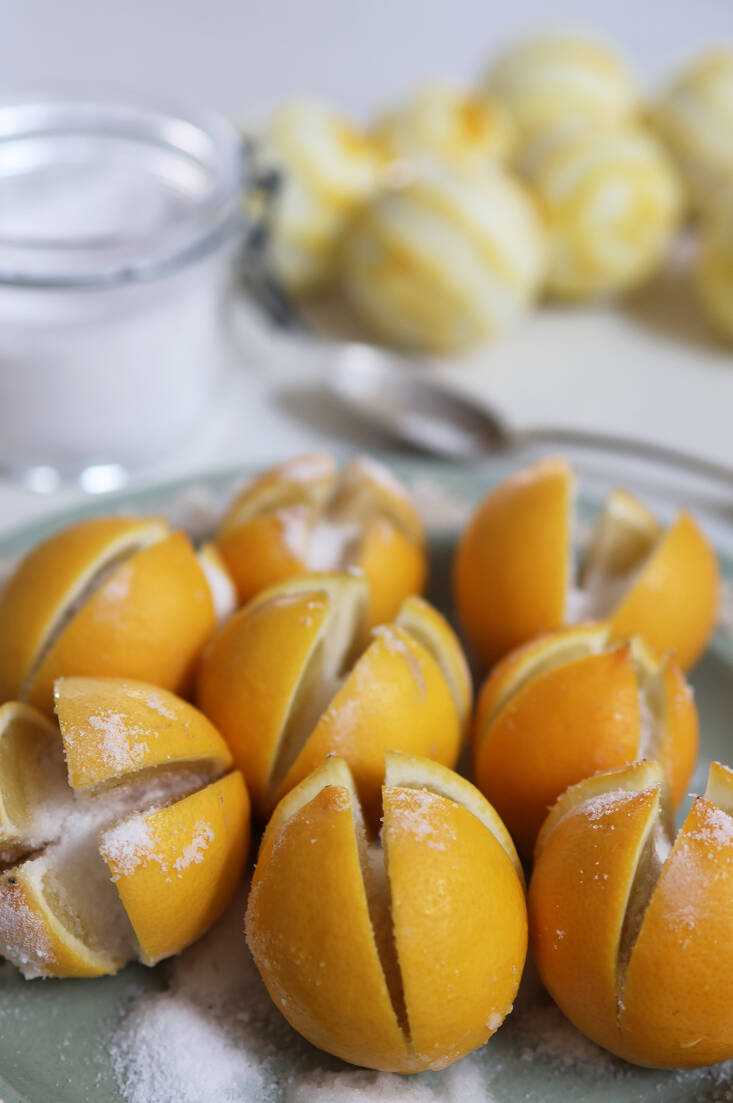 Above: Over the next few days the salt will draw out additional juice from the cut lemons, to cover them.
