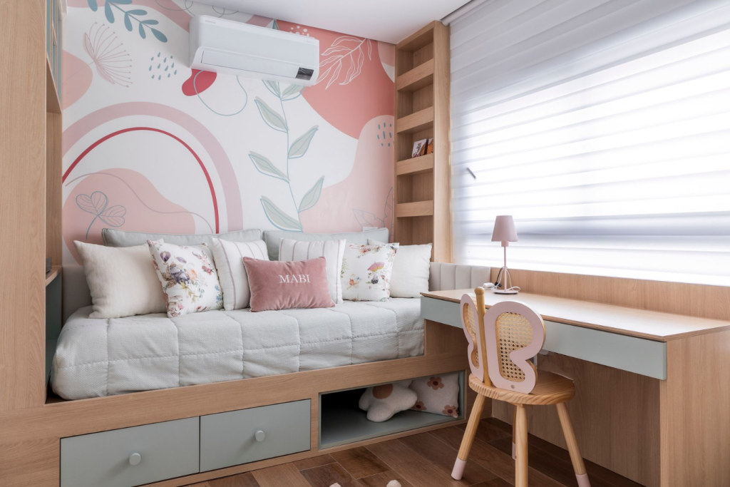 Móveis com espaço interno ajudam muito. Cama com baú substitui um armário extra, e gavetas sob beliches guardam roupas de cama de forma prática. Nichos em diferentes alturas deixam tudo acessível: os maiores para pelúcias e bolas, os menores para carrinhos e bonecas.