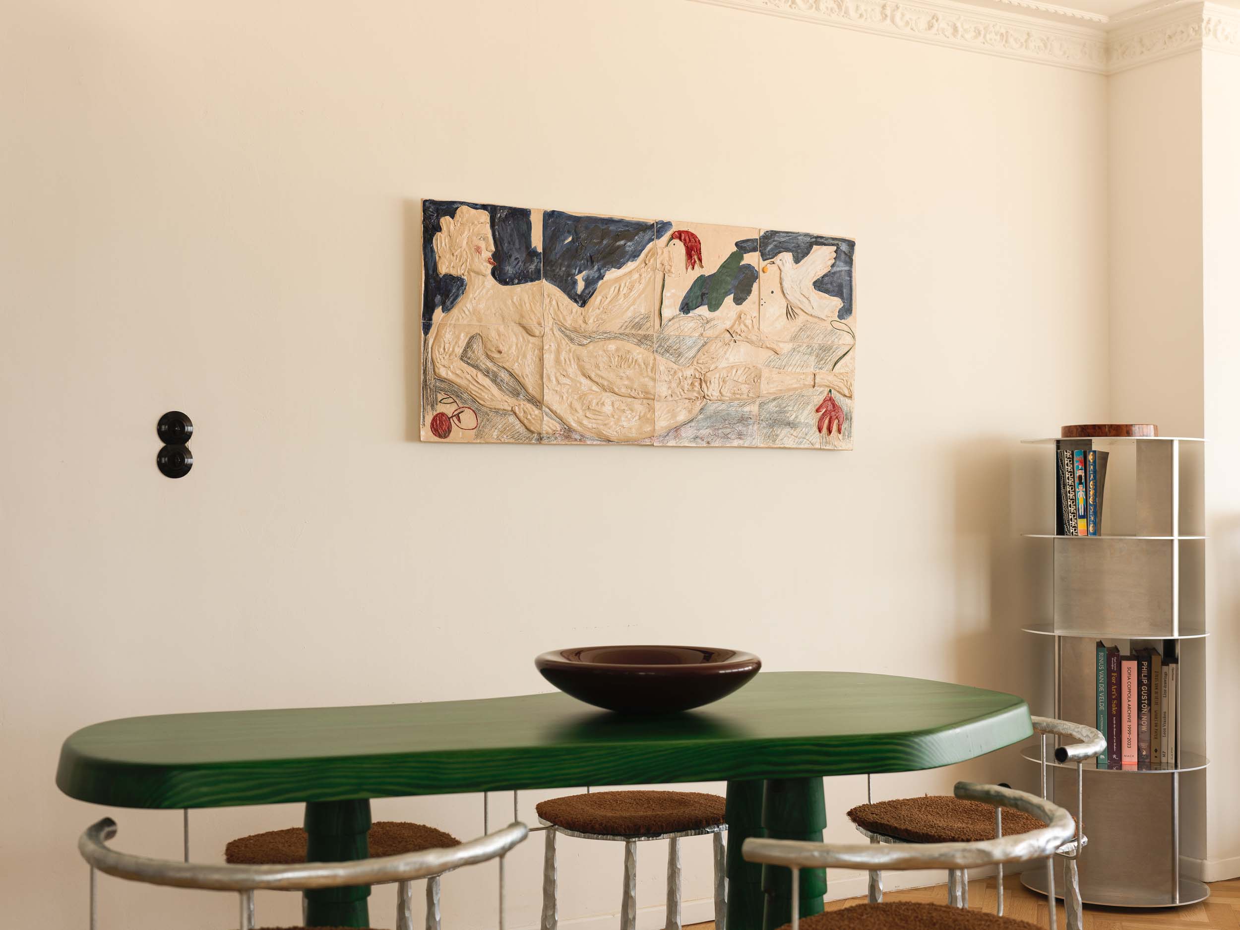 «Gli elementi in ceramica, le sedie in acciaio di Thomas Serruys e la poltrona scultorea del soggiorno di Destroyers/Builders aggiungono una dimensione più grezza e organica all’ambiente», afferma il duo proprietario di casa. Per le opere d’arte, Albane Paret e Micha Pycke hanno collaborato con Sofie Steegen, che presenta due delle sue ultime opere: una che funge anche da lampada e il bassorilievo in ceramica che domina la zona pranzo introducendo i temi di erotismo, mitologia e natura. «Un aspetto importante di questo progetto è la nozione dilatata di tempo in un ambiente stimolante con un’atmosfera privata dove godersi gli oggetti e le opere d’arte con la famiglia o gli amici, senza lo sguardo di estranei», riassumono Paret e Pycke.