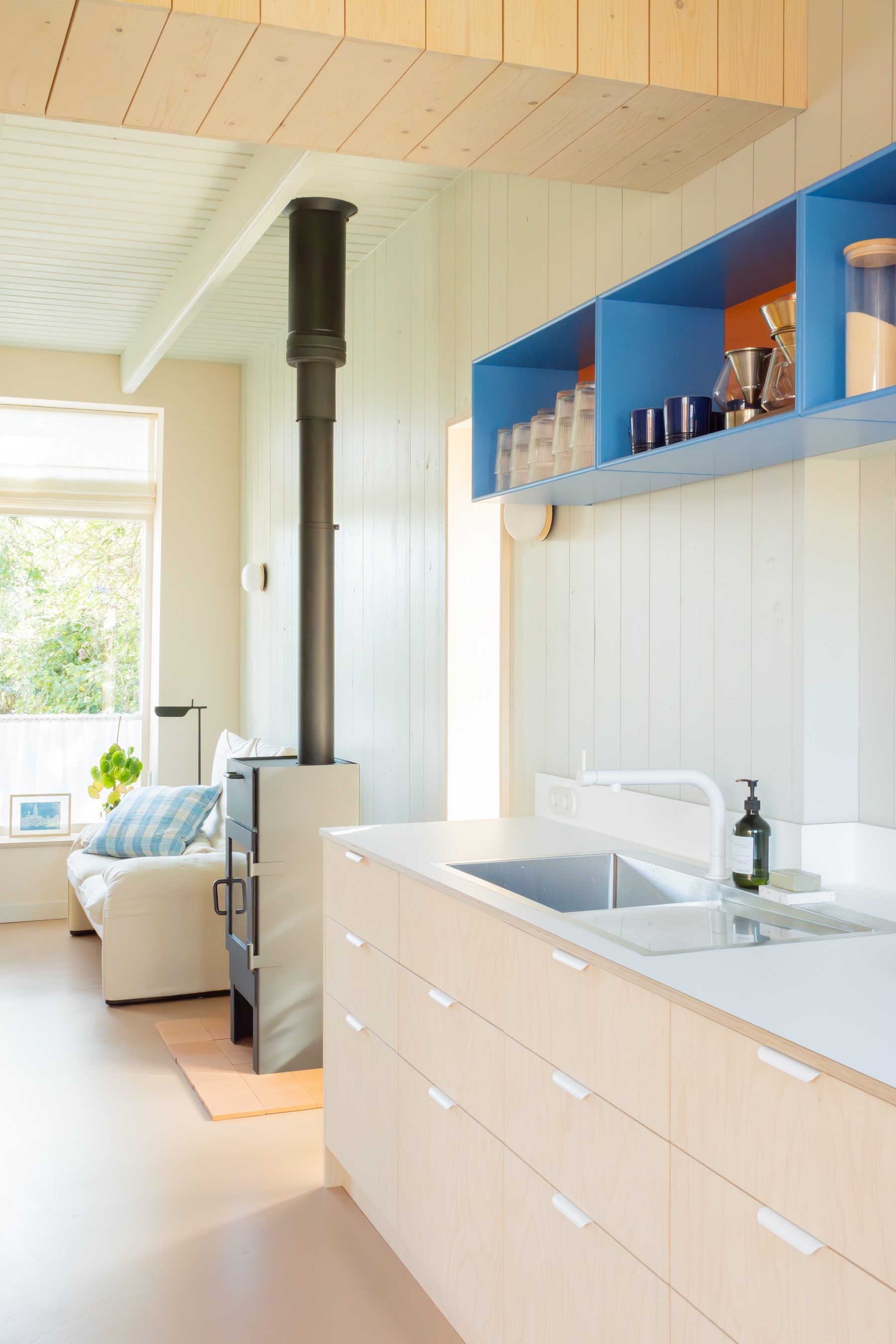 Above: The kitchen cabinets are birch plywood with a thin laminate counter and a barely noticeable induction cooktop.