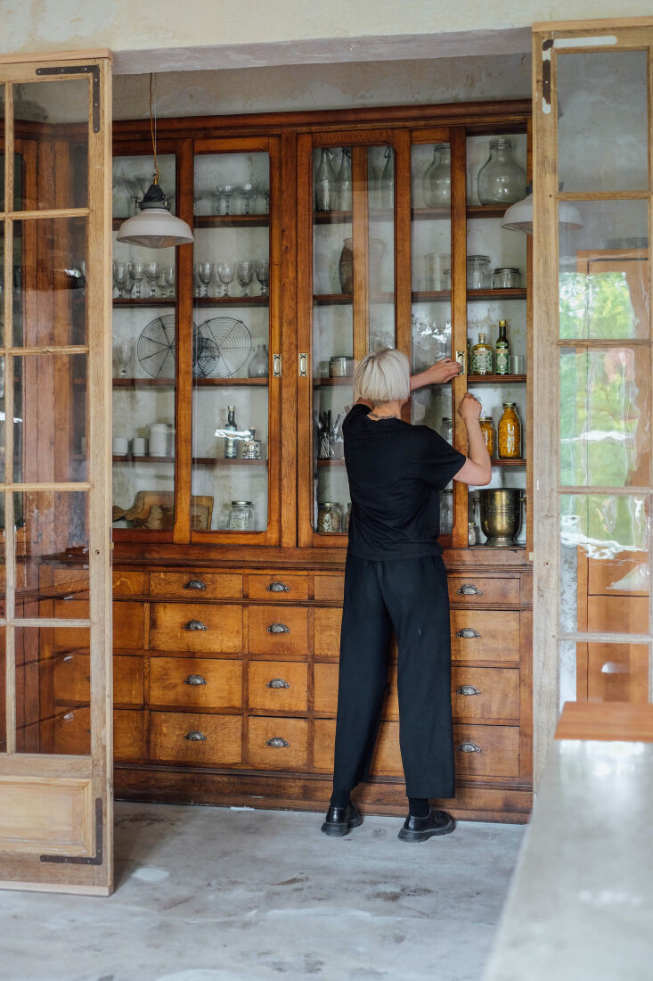 Above: The two worked to restore a sense of the old. “All the vintage details and the wooden doors you can see in the pictures were sourced by us,” Laura writes. “Nora has a very good eye and talent for finding rare vintage things, like the old pharmacy cabinet in the pantry. I have no idea how she does it, but she always finds the most unique and stunning vintage pieces.” That, and the glass doors, are antiques.