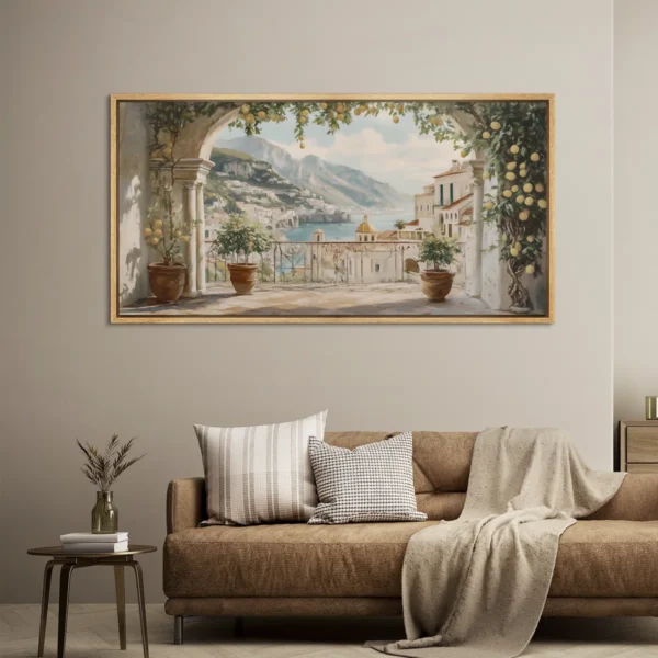 Nothing says la dolce vita like a sweeping Mediterranean view. This framed canvas transports your living room straight to the Amalfi Coast with its soft colors, coastal scenery, and romantic architecture. Hang it above your sofa or dining area for a touch of Italian escape.