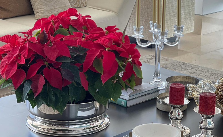 A poinsétia (Euphorbia pulcherrima), também conhecida como bico-de-papagaio ou flor de Natal, é uma das plantas mais tradicionais dessa época do ano. Suas flores, que podem ser no tom vermelho clássico, brancas, rosadas ou até manchadas, representam alegria e celebração. Coloque os vasos de poinsétia sobre a mesa de jantar, aparadores ou na entrada da casa.