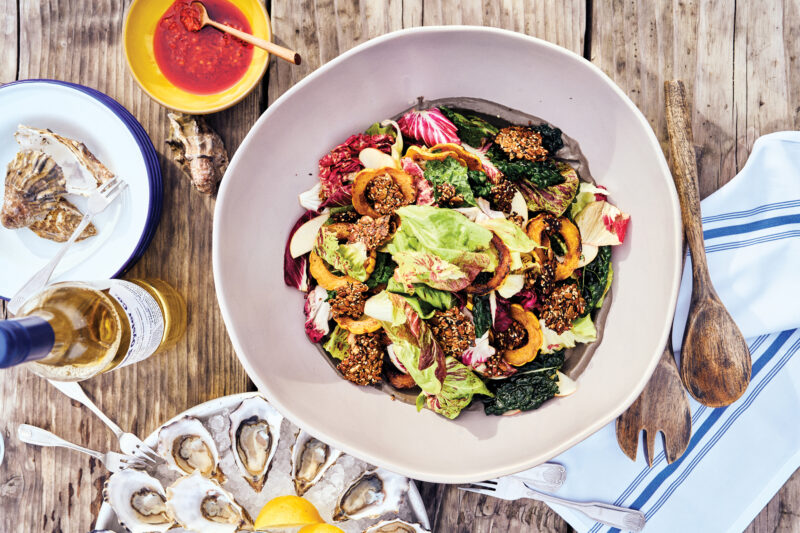 Celebrate autumn with this vibrant chicory salad, featuring sweet roasted delicata squash, crisp apples, and a savory seed and seaweed granola. The black tahini dressing adds a nutty, creamy richness that ties the ingredients together beautifully.