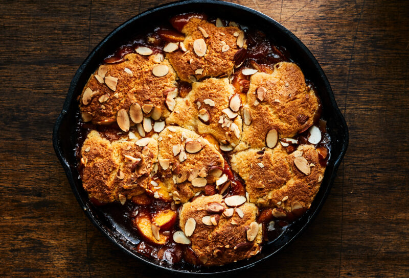 You know those sweet, drippy peaches you dream about all year? When you’ve had your fill standing over the sink, bake up the rest with dark brown sugar, booze, and a tender topping. And if you see them in late summer, try the recipe with O’Henry peaches: Firm yet satiny, they have a perfect sweet-acid balance and freestone flesh, meaning they’re a cinch to pit.