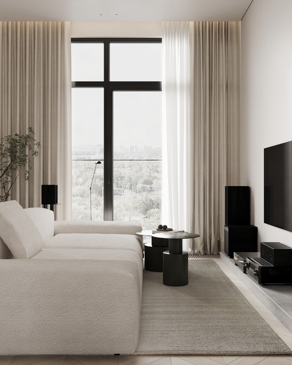 The living space feels like a quiet retreat wrapped in sunlight. A sculptural white sofa anchors the room. Its soft texture contrasts with the olive-toned tables beside it. Natural light pours through full-height windows, softening the black accents of the entertainment setup and dining chairs. Every detail — from the warm wood tones to the muted textiles — speaks the language of modernism.