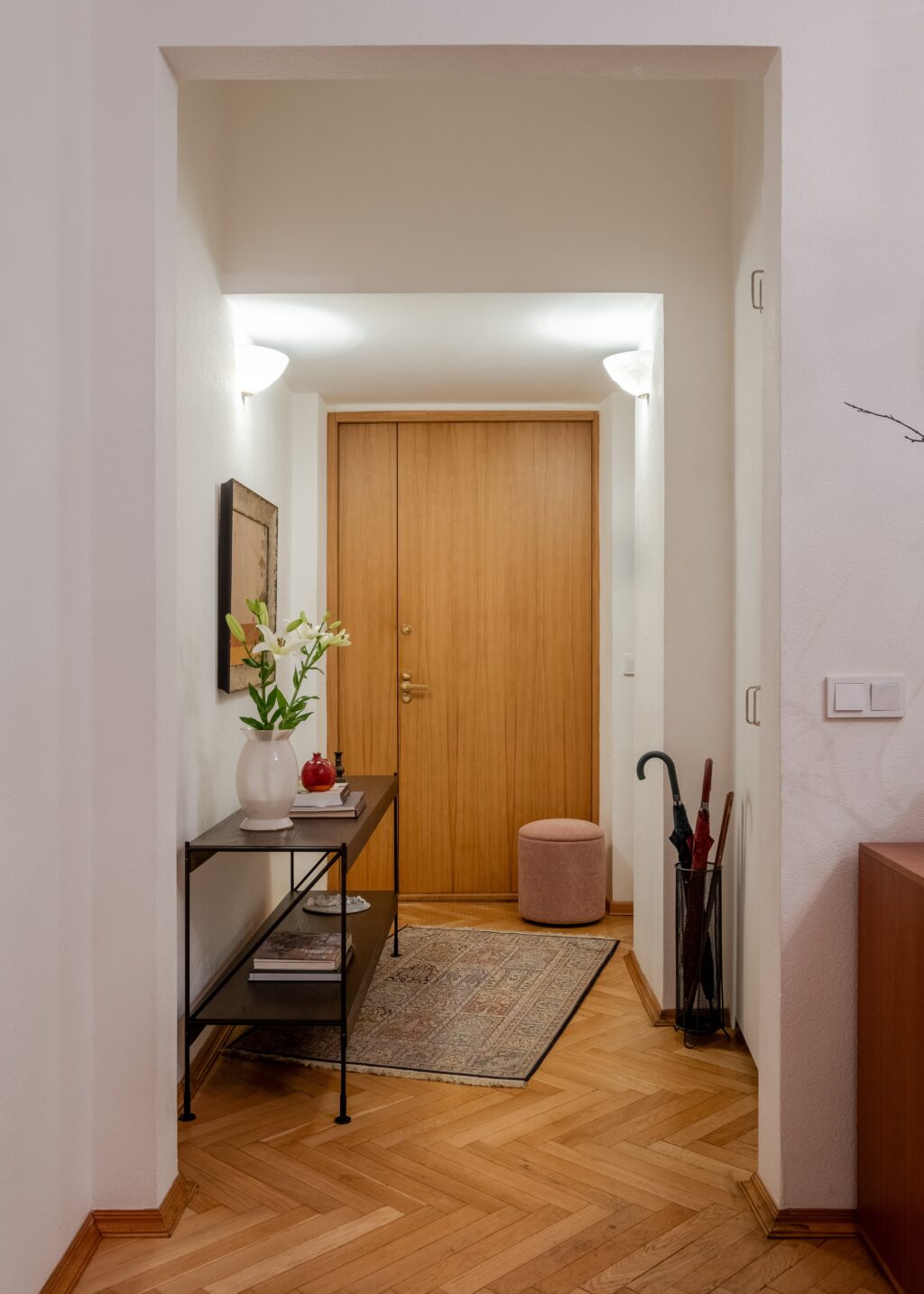 The hallway opens up into what feels like a mini gallery. The herringbone parquet guides you forward, while bold artwork adds energy to the otherwise serene layout. A sculptural console sits along one wall, pairing clean lines with organic decor pieces. Opposite it, a soft bench and floor lamp create a quiet pause point—somewhere to sit, read, or simply enjoy the apartment’s natural light.